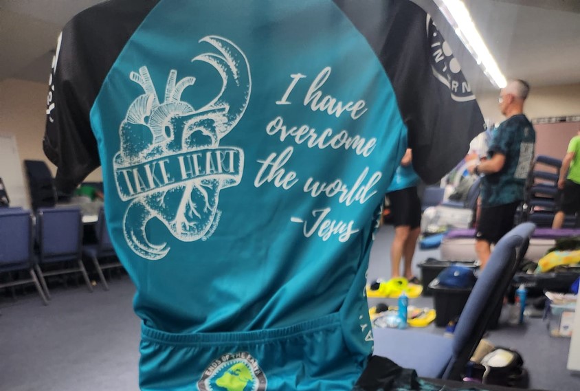 At Ends of the Earth Cycling, we are proud of the custom cycling kit that we design for each season of tours. That is because we use our eye-catching designs to proclaim Jesus. The back of this year’s jersey features a heart emblazoned with the words “take heart” and another snippet of the words of Jesus from John 16:33, “I have overcome the world.”